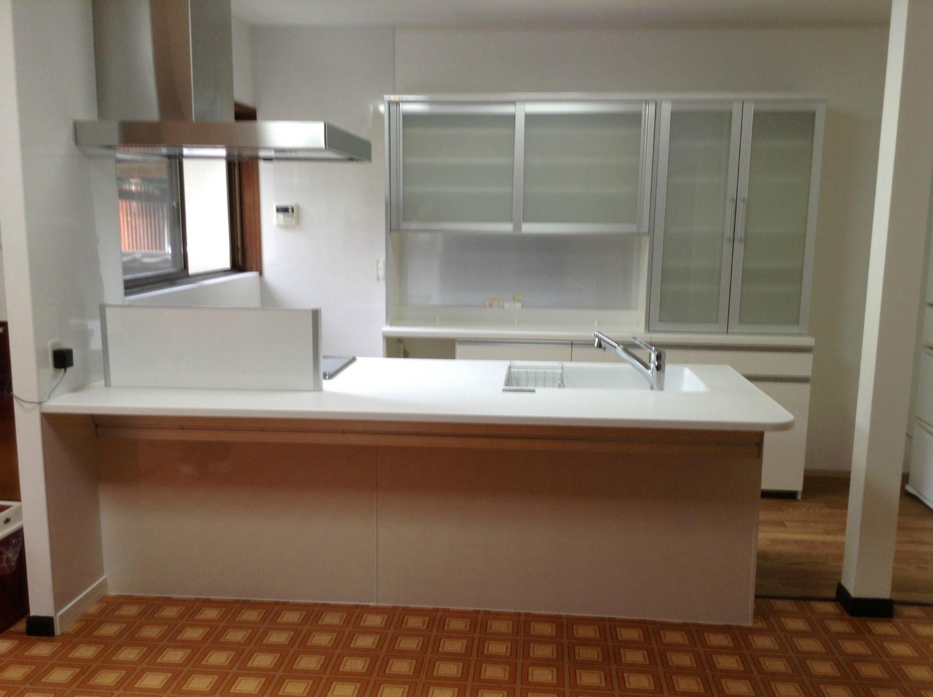 台所のコーナーに吊戸棚とカウンターを作って新築当時でもおしゃれな台所でしたが少し狭いのと換気扇がフード型では無かったので換気も不十分でした。