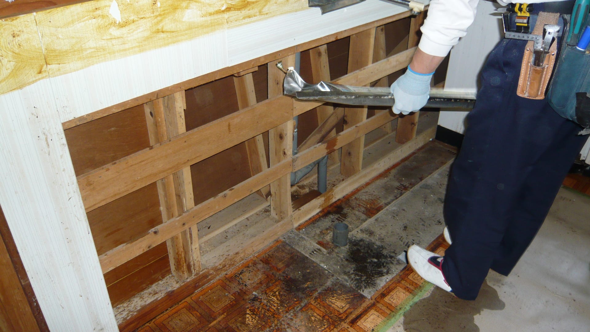 撤去し終わったところ、床が結構傷んでいるようなので急きょ床板も張り替えする事にします。