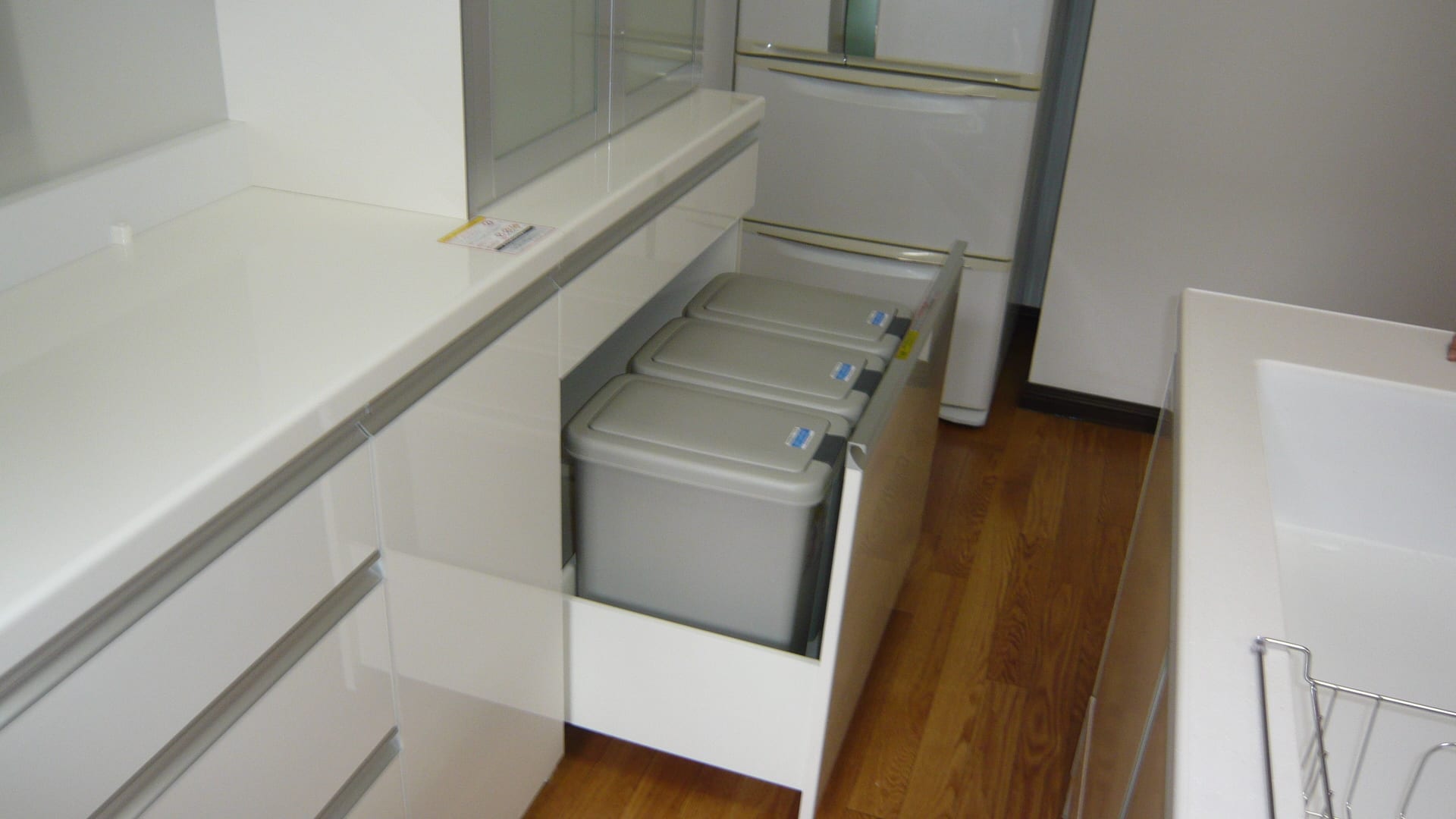食器棚の下は引出式のごみ収納になっていますので綺麗に使ってもらえると思います。