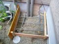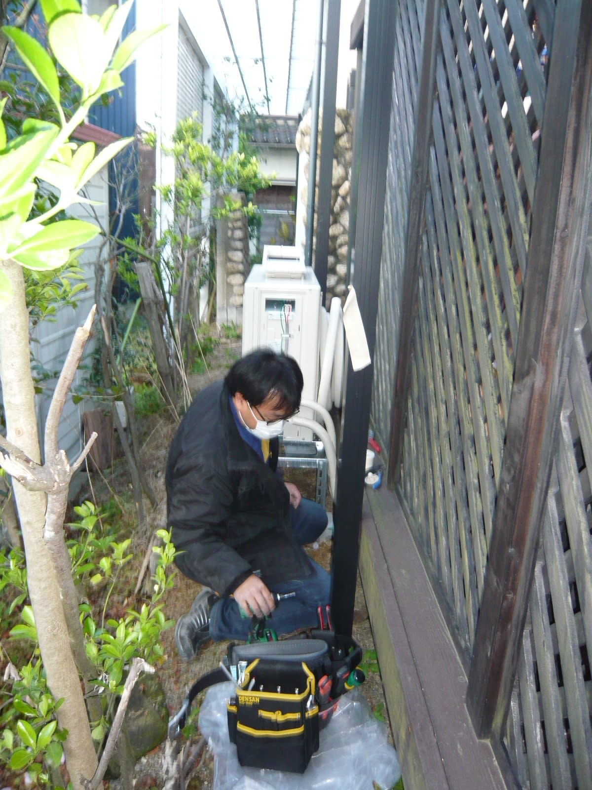 次は外機の接続です、このお宅は本体の取り付け場所が塀で囲まれているので室外機はウッドデッキの外側に取り付けしました。